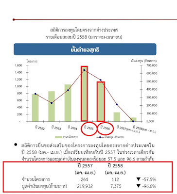 แต่กลับกันเมื่อเกิดการรัฐประหาร 22 พฤษภาคม 2557 โดย คสช. ของ พล.อ.ประยุทธ์ จันทร์โอชา กลับพบว่า ช่วงเดือน มกราคม-เมษายน 2558 สถิติจากข้อมูลของ กองความร่วมมือการลงทุนระหว่างประเทศ สำนักงาน BOI กลับชี้ให้เห็นว่ามีจำนวนการลงทุนเพียง 112 โครงการ มูลค่าเงินลงทุนเพียง 7,375 ล้านบาท ซึ่งถือว่า จำนวนโครงการลดลงมากถึงร้อยละ 57.5 และมูลค่าเงินลงทุนลดลงถึงร้อยละ 96.6 ตามลำดับ