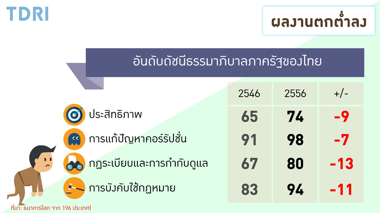 งบบุคลากรที่เพิ่มขึ้นอย่างมากอาจจะไม่ได้ส่งผลให้ผลงานของภาครัฐใน 10 ปีที่ผ่านมาดีขึ้นเท่าที่ควร เพราะทั้งประสิทธิภาพและความโปร่งใสของภาครัฐแย่ลงจากเมื่อ 10 ปีที่แล้ว จากผลการวิจัยของธนาคารโลกพบว่า ความมีประสิทธิผลของรัฐบาลไทยอยู่อันดับ 74 จาก 196 ประเทศ ตกลงจากอันดับ 65 เมื่อสิบปีก่อน ปัญหาคอร์รัปชั่นในภาครัฐก็แย่ลงเช่นกัน จากผลวิจัยของธนาคารโลกเช่นเดียวกัน พบว่าไทยตกจากอันดับ 91 เมื่อสิบปีก่อน มาเป็นอันดับ 98 จาก 196 ประเทศ World Economic Forumสำรวจและจัดอันดับเรื่องการเล่นพรรคเล่นพวกของข้าราชการไทยอยู่อันดับ 93 จาก 148 ประเทศ อันดับใกล้เคียงกับประเทศอินเดีย (94) และมาลาวี (92)