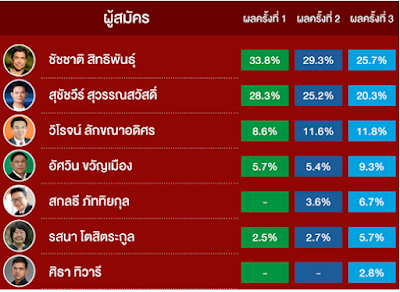 มีข้อสังเกตุว่าเป็นคนเดียวในสามตัวนำที่คะแนนมีแต่เพิ่ม ขณะที่อันดับ ๑ และ ๒ คะแนนตกมาเรื่อยๆ จากการสำรวจ ๓ ครั้ง ส่วนพวกที่ได้ไม่ถึง ๑๐% อัศวิน ขวัญเมือง ไม่น่าจะถูกทิ้งไว้ข้างหลังเมื่อถึงปลายทาง คะแนนเพิ่มเรื่อยๆ เหมือนกัน ตอนนี้ได้ ๙%