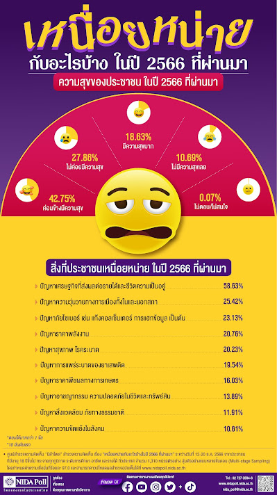 ท้ายที่สุดเมื่อถามถึงสิ่งที่ประชาชนเหนื่อยหน่าย ในปี 2566 ที่ผ่านมา พบว่า ตัวอย่าง ร้อยละ 58.63 ระบุว่า ปัญหาเศรษฐกิจที่ส่งผลต่อรายได้และชีวิตความเป็นอยู่ รองลงมา ร้อยละ 25.42 ระบุว่า ปัญหาความวุ่นวายทางการเมืองทั้งในและนอกสภา ร้อยละ 23.13 ระบุว่า ปัญหาภัยไซเบอร์ เช่น แก๊งคอลเซ็นเตอร์ การแฮกข้อมูล เป็นต้น ร้อยละ 20.76 ระบุว่า ปัญหาราคาพลังงาน ร้อยละ 20.23 ระบุว่า ปัญหาสุขภาพ โรคระบาด ร้อยละ 19.54 ระบุว่า ปัญหาการแพร่ระบาดของยาเสพติด ร้อยละ 16.03 ระบุว่า ปัญหาราคาพืชผลทางการเกษตร ร้อยละ 13.89 ระบุว่า ปัญหาอาชญากรรม ความปลอดภัยในชีวิตและทรัพย์สิน ร้อยละ 11.91 ระบุว่า ปัญหาสิ่งแวดล้อม ภัยทางธรรมชาติ ร้อยละ 10.61 ระบุว่า ปัญหาความขัดแย้งในสังคม ร้อยละ 9.85 ระบุว่า ไม่เหนื่อยหน่ายกับอะไรเลย ร้อยละ 9.62 ระบุว่า ปัญหาการคอรัปชันในทุกระดับ ร้อยละ 7.56 ระบุว่า ปัญหาการจราจร ร้อยละ 5.65 ระบุว่า ปัญหากระบวนการยุติธรรม ร้อยละ 5.19 ระบุว่า ปัญหาการแต่งตั้งโยกย้ายที่ไม่เป็นธรรม ในระบบราชการ ร้อยละ 4.58 ระบุว่า ปัญหาสงคราม ความขัดแย้งในต่างประเทศ และร้อยละ 0.92 ระบุอื่น ๆ ได้แก่ ปัญหาการทำงาน ปัญหาครอบครัว และปัญหาความรัก