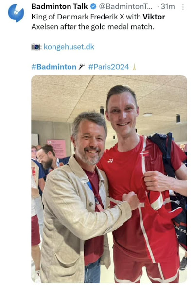 ในการแข่งขันชิงเหรียญทองกีฬาแบดมินตันในการแข่งขันกีฬาโอลิมปิก ณ กรุงปารีส ที่เพิ่งจบลงนั้น พระราชาเฟรเดอริคที่สิบแห่งราชอาณาจักรเดนมาร์กทรงเสด็จพระราชดำเนินไปในการนี้ด้วย ทรงประทับอยู่กลางผู้ชมในสนามอย่างไม่ถือพระองค์ ก่อนการแข่งขันแทบจะไม่มีใครสังเกตว่าพระองค์ประทับอยู่ในสนามด้วย เนื่องจากก่อนการแข่งขันพระองค์มิได้ปิดถนนในการพระราชดำเนินทอดพระเนตรการแข่งขันนี้